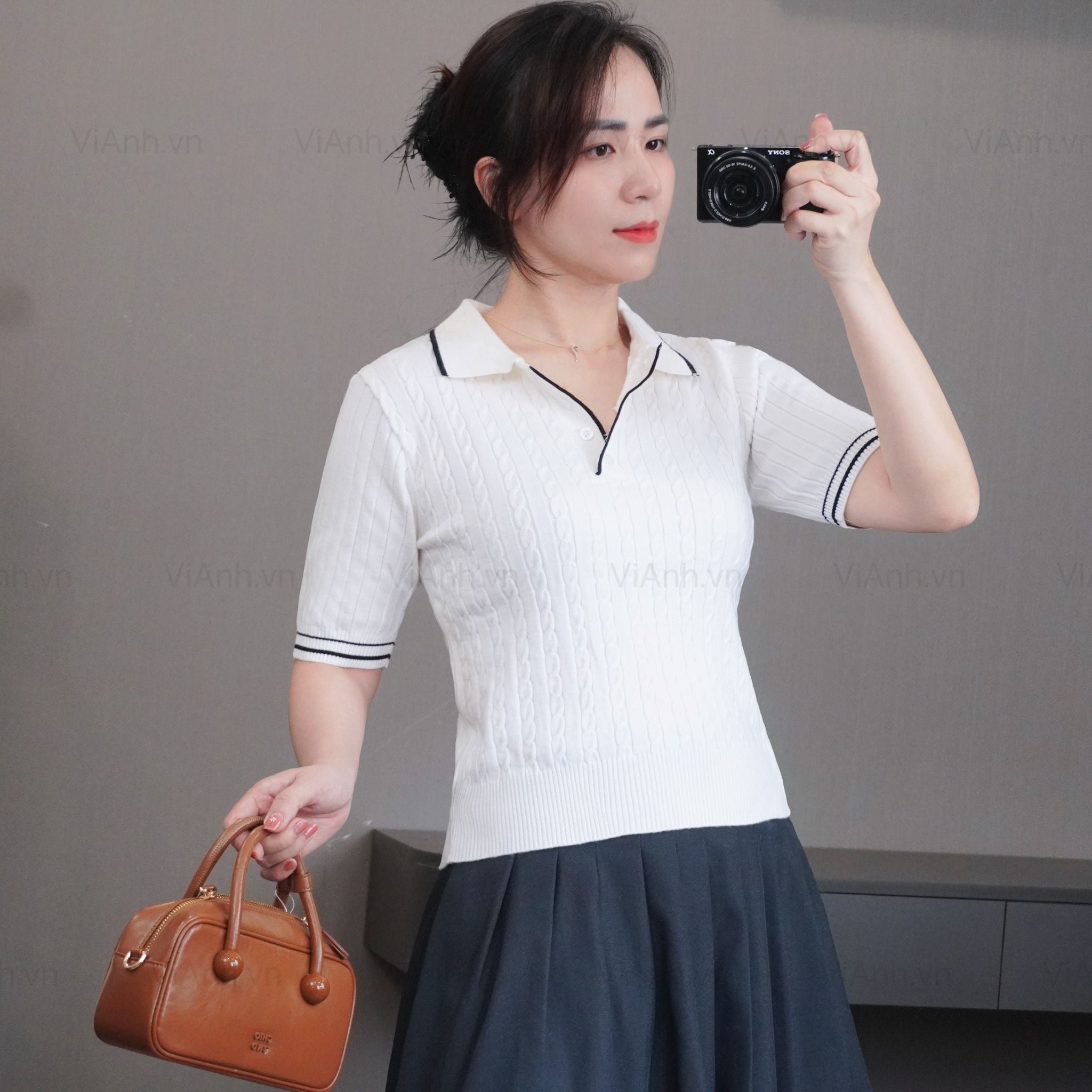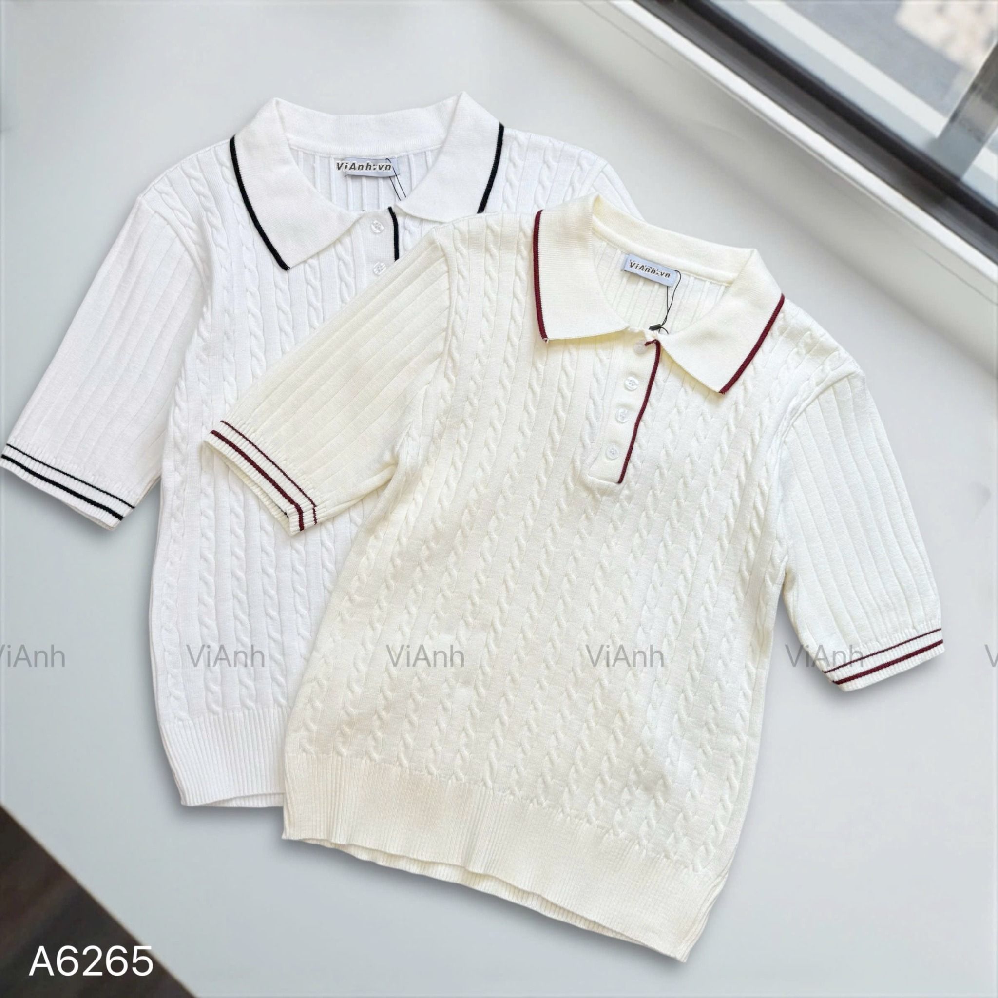 Áo len T66 ngắn tay có cổ style Hàn / TRẮNG VIỀN ĐEN