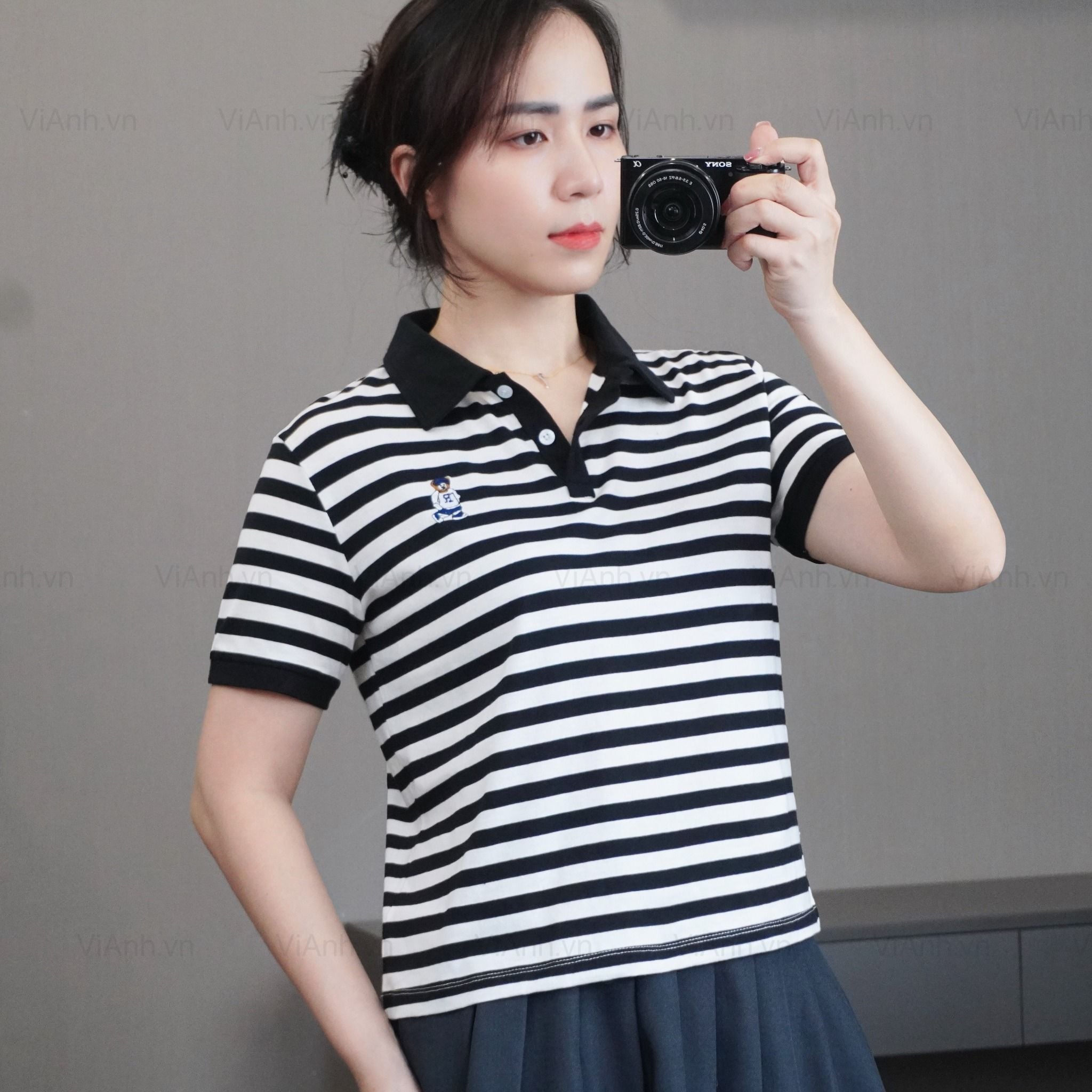 Áo A63 thun thêu gấu cổ polo style Nhật A6263 / KẺ TRẮNG ĐEN