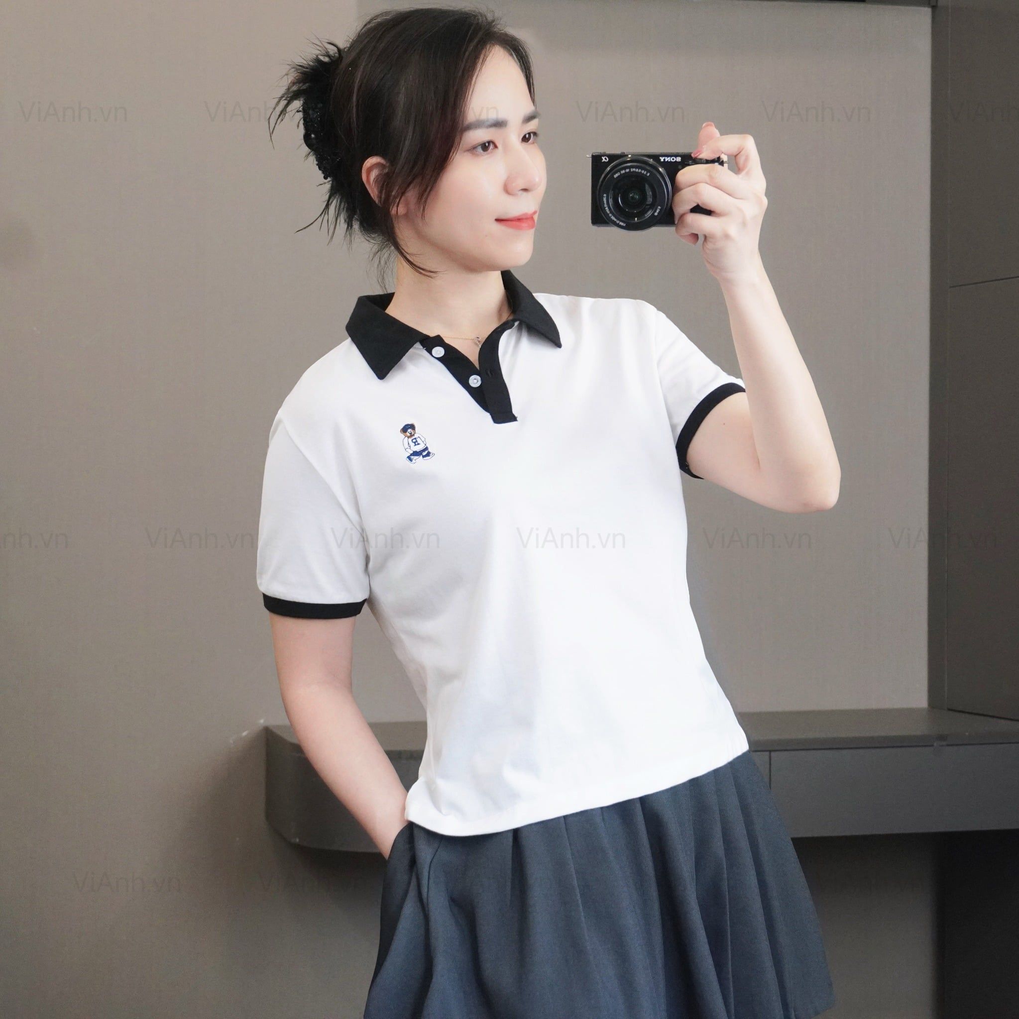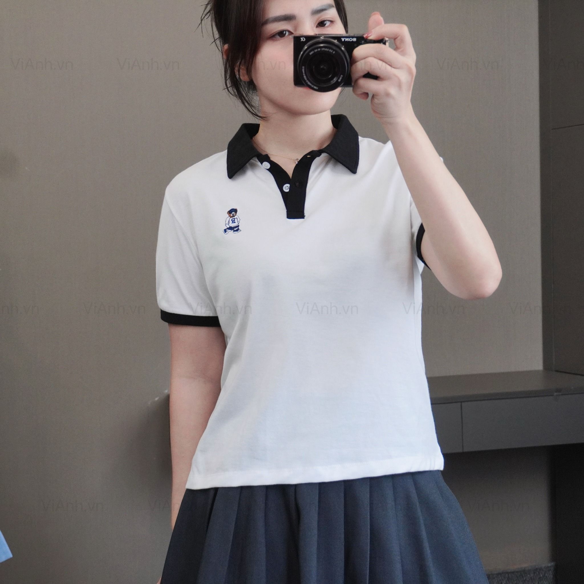 Áo C450 thun thêu gấu cổ polo style Nhật A6261 / TRẮNG CỔ ĐEN