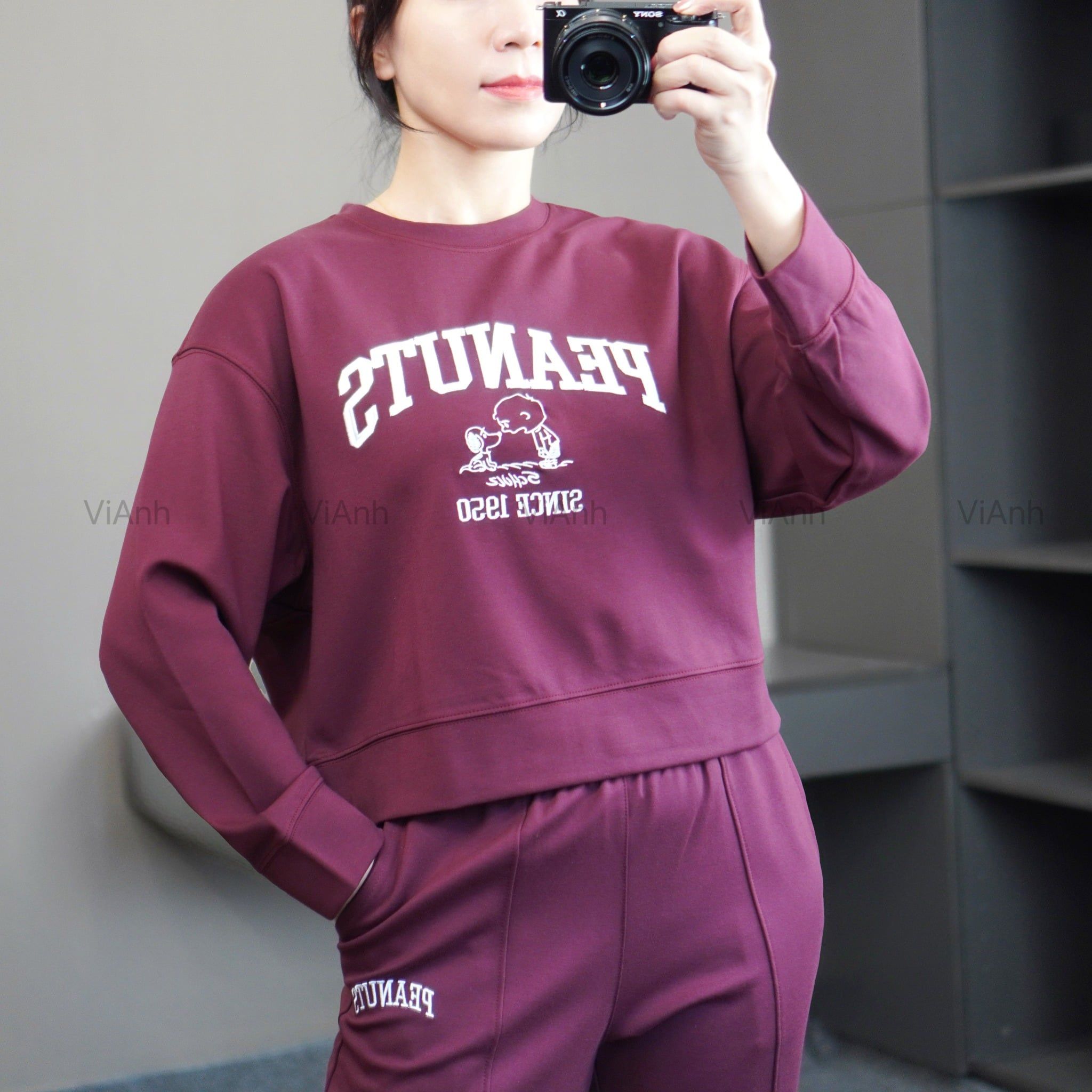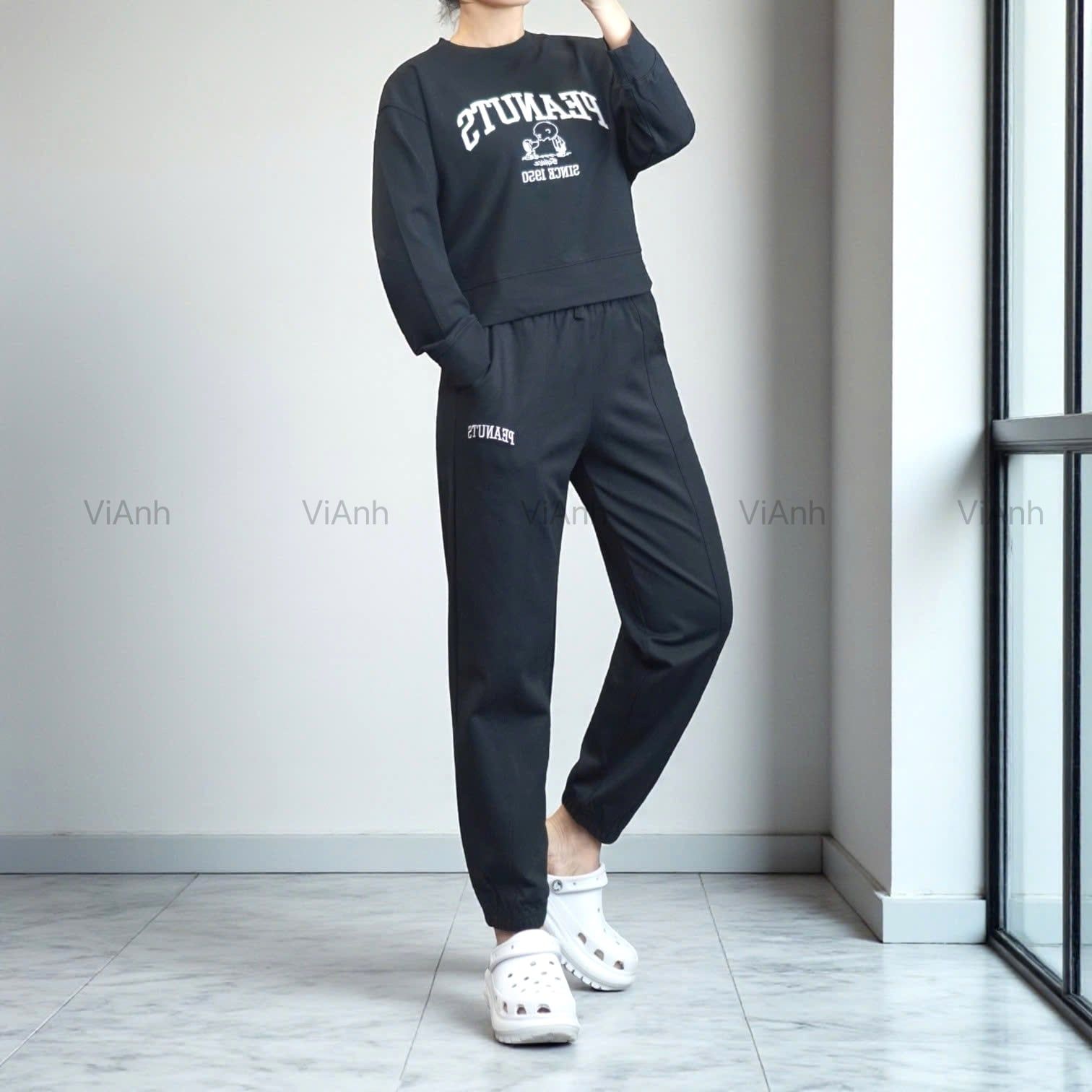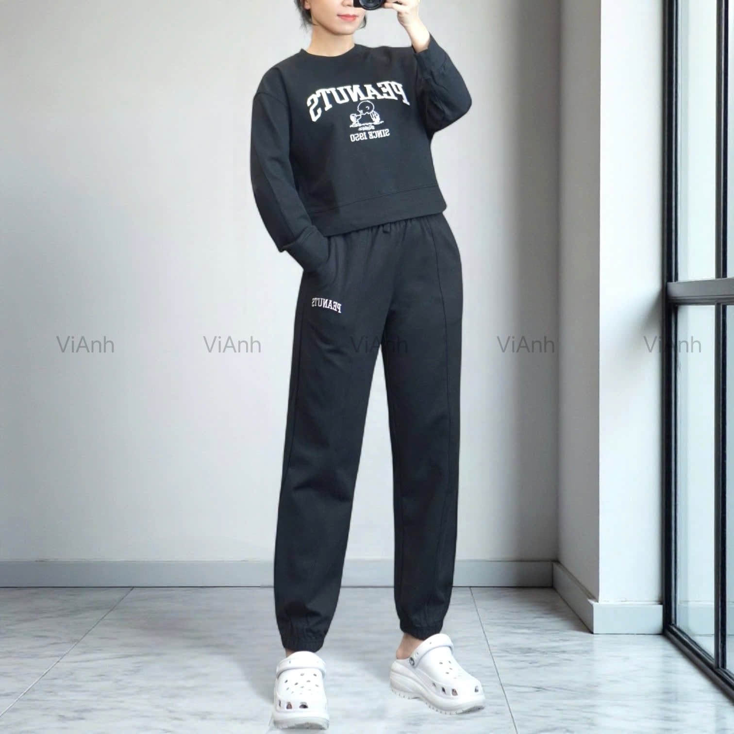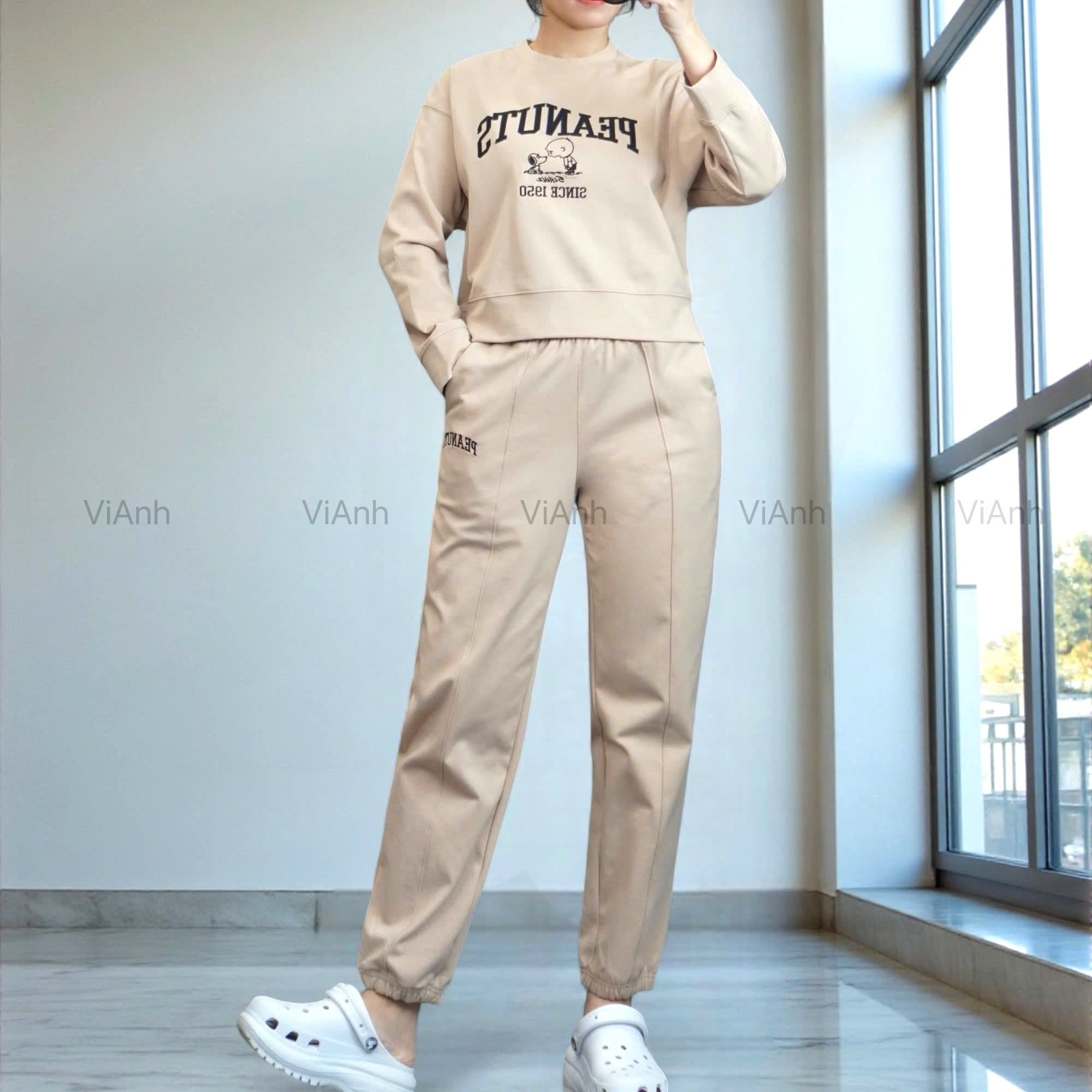 Bộ dài tay hình thêu PEANUTS Uni chất Umi Hàn