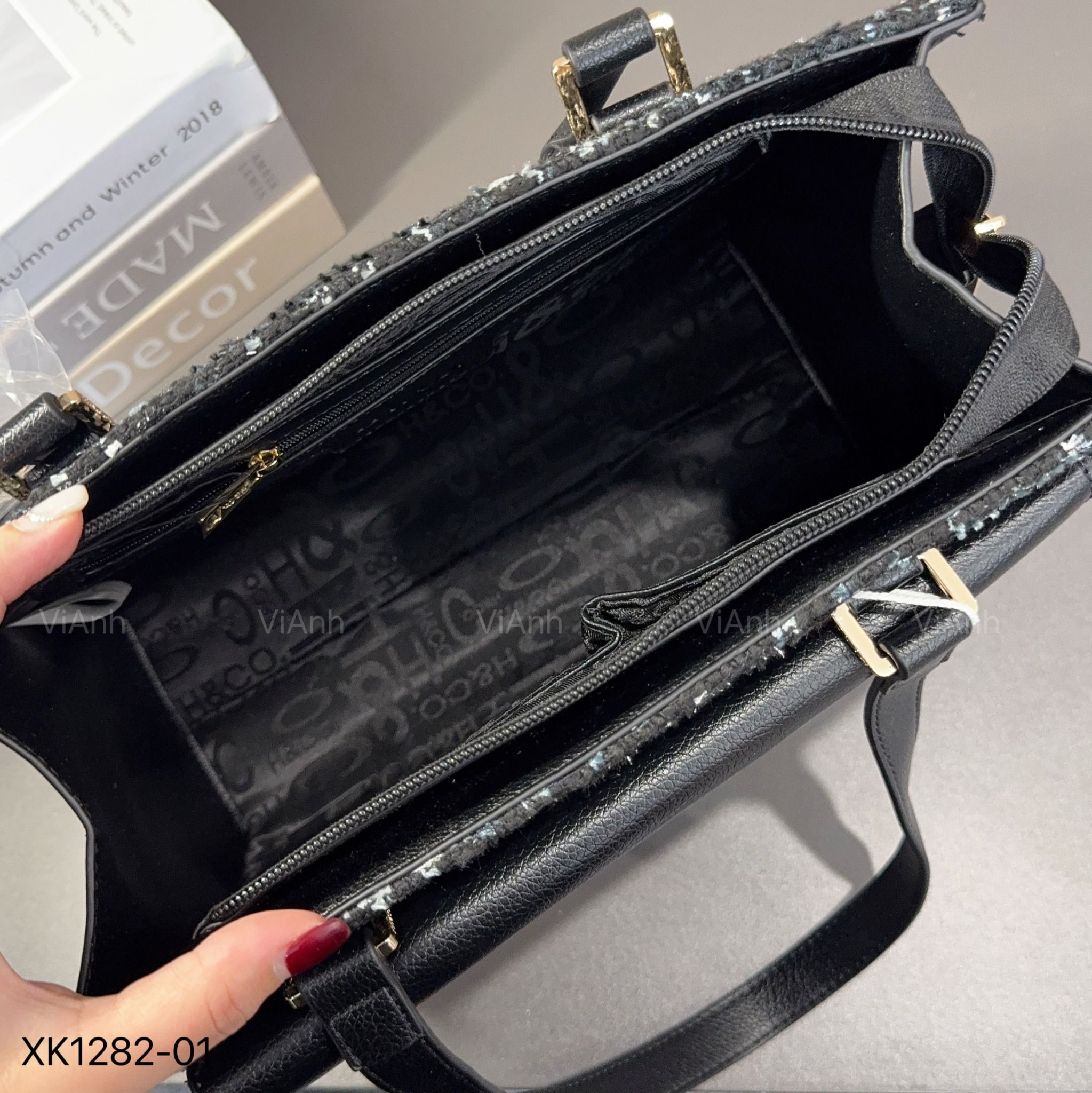 SET D82 Túi xách style Âu Mỹ chữ nhật xách tay dạ tweed phối da CĐC / 28x23 / ĐEN