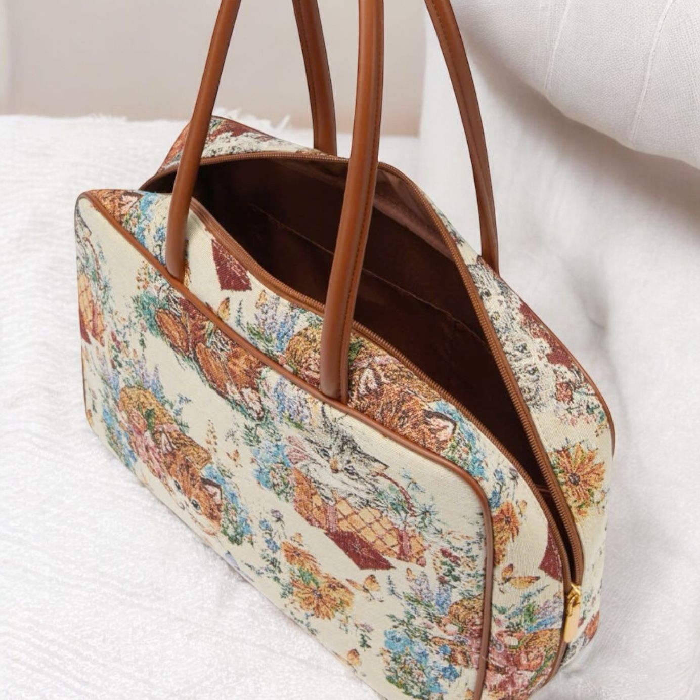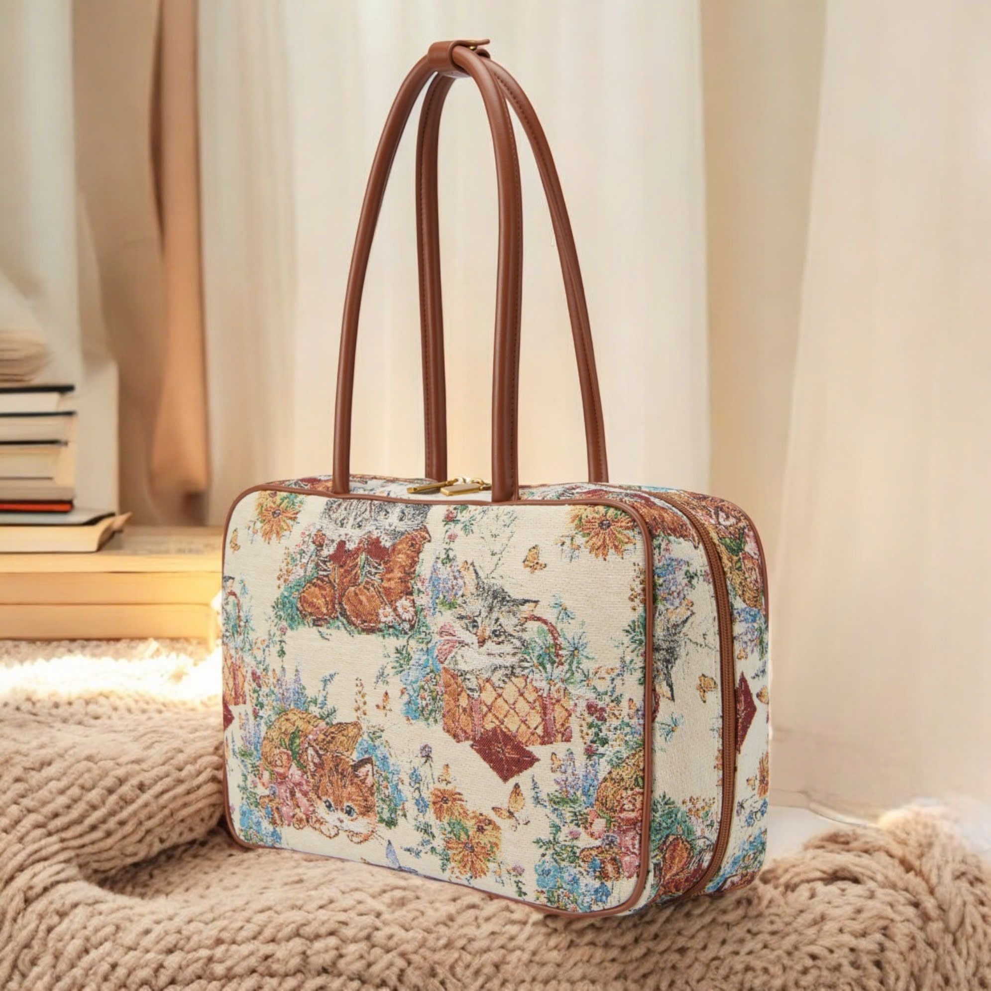 Túi A534 xách chữ nhật vải canvat hoạ tiết TX1306 / 34x24 / TRẮNG VIỀN NÂU